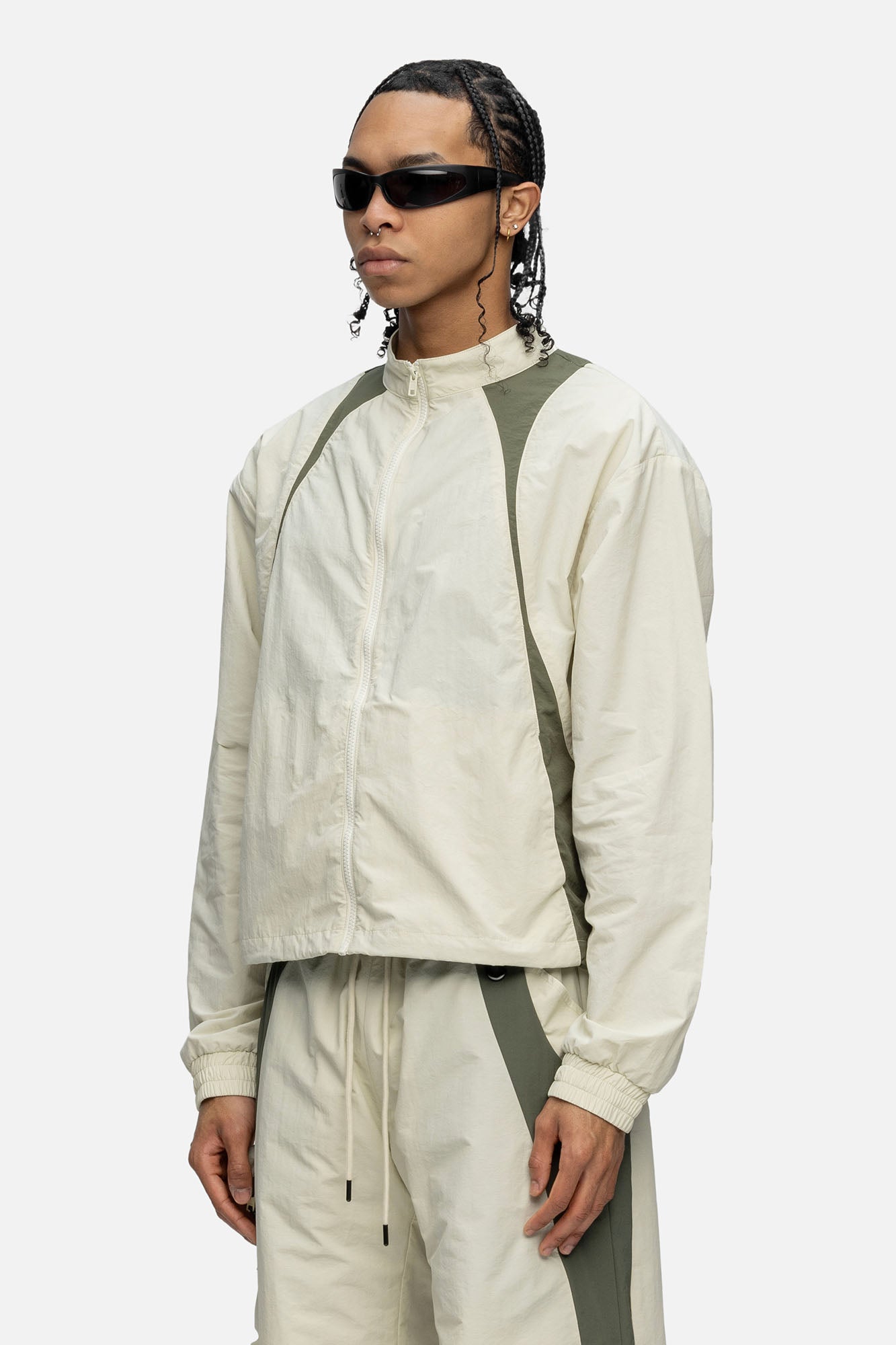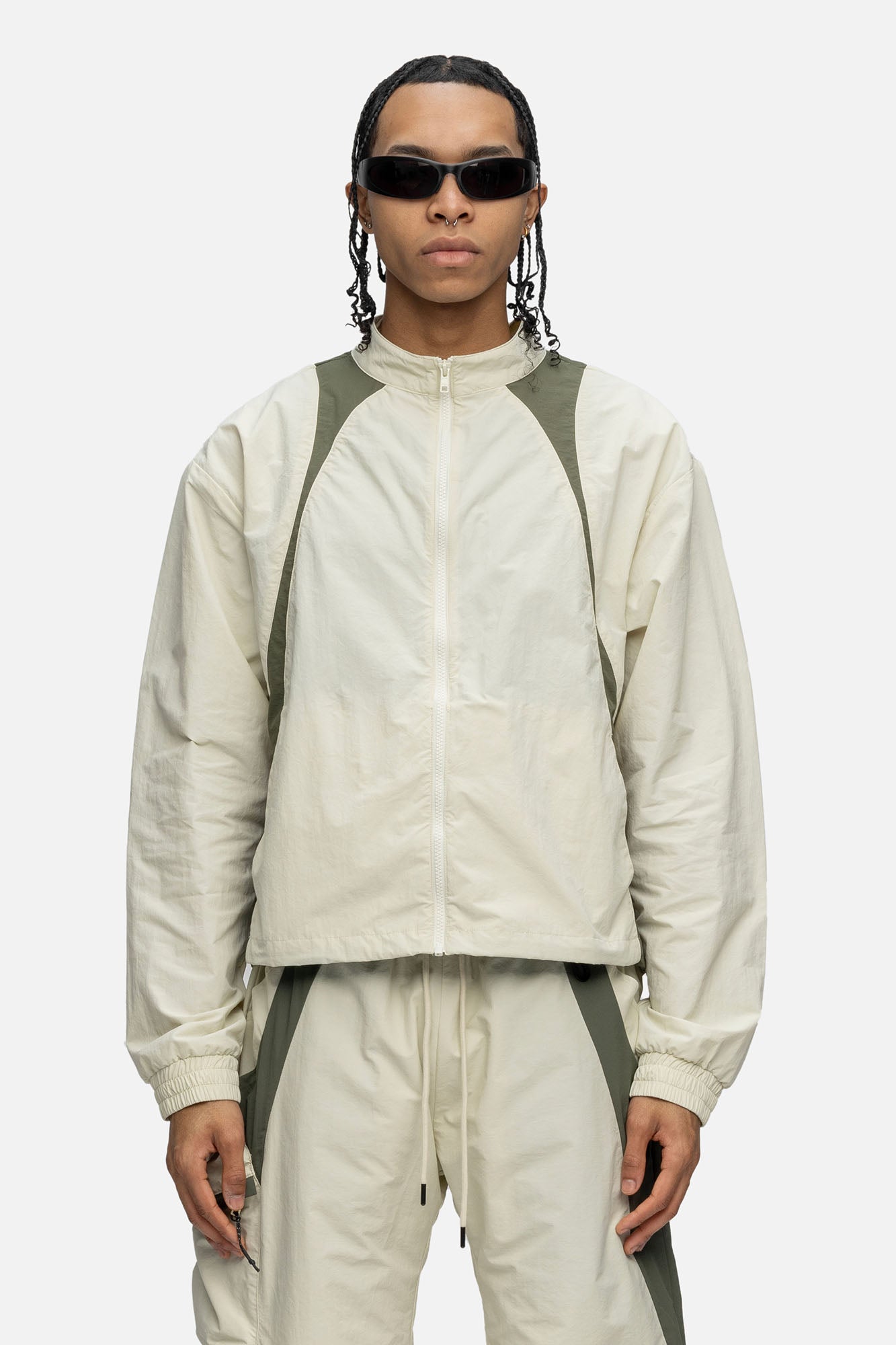 Crafted from cotton mixed nylon taffeta, the Studio Jacket features decorative lines on both side, hidden pockets at the front, and finished off with drawstrings at the hem.