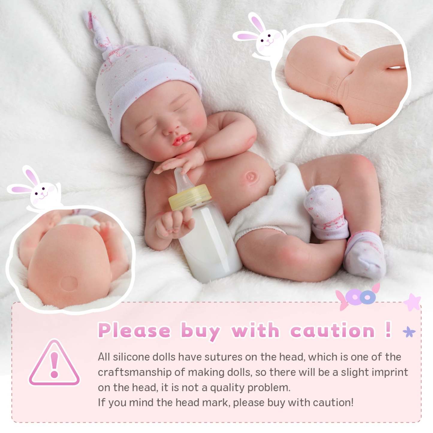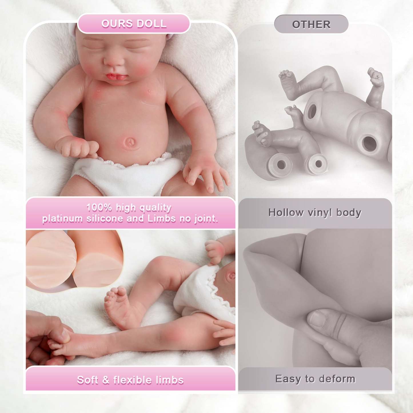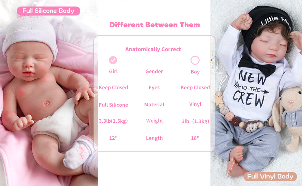 - Silicone dolls are quite different from vinyl-reborn babies. They are very soft, move freely, and need to be handled as you would handle a newborn baby (especially the soft heavy head). Do not stretch the arms, legs, or any parts of the baby, they may be torn or ruptured. Not recommended for children.