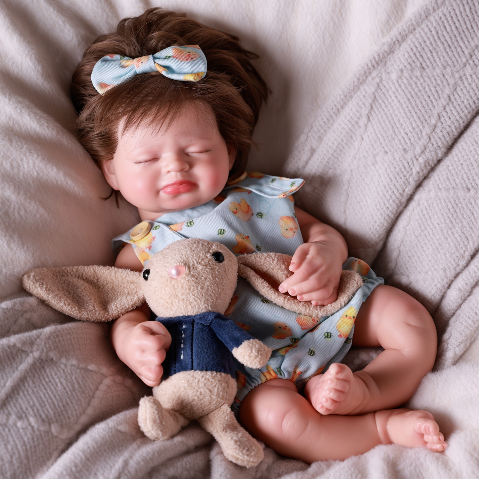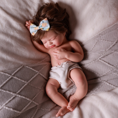 This baby doll was painted with a kind of professional silicone pigments and it is sealed with a high-quality matte finish for a soft and smooth baby-skin feel. She has soft veining, beautiful mottling, fine capillaries, detailed nails, newborn milia, and lifelike shading. Her delicate eyebrows are a combination of mono-rooting and finely detailed painting.
