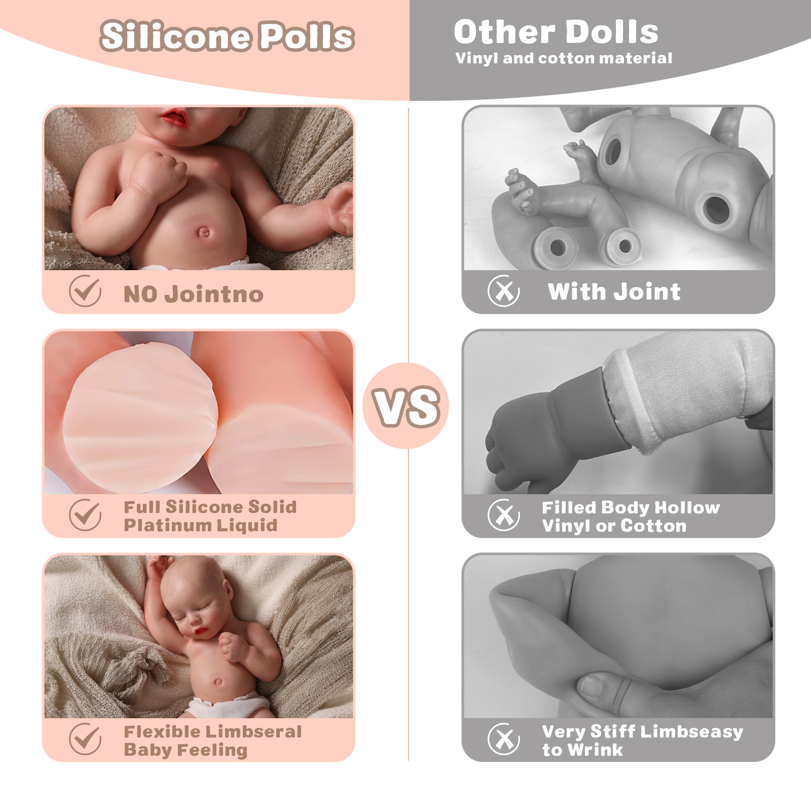 - Silicone dolls are quite different from vinyl-reborn babies. They are very soft, move freely, and need to be handled as you would handle a newborn baby (especially the soft heavy head). Do not stretch the arms, legs, or any parts of the baby, they may be torn or ruptured. Not recommended for children.