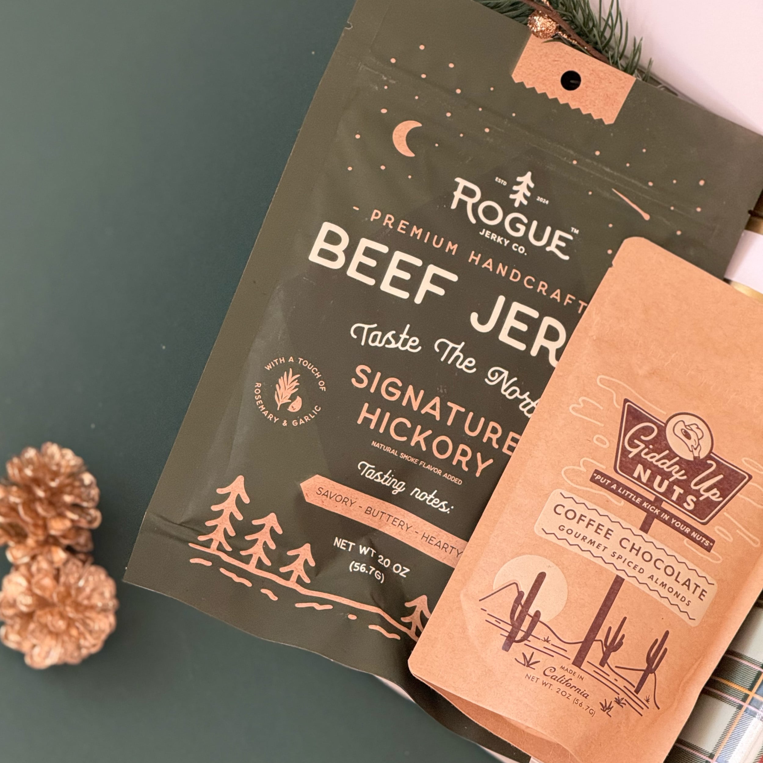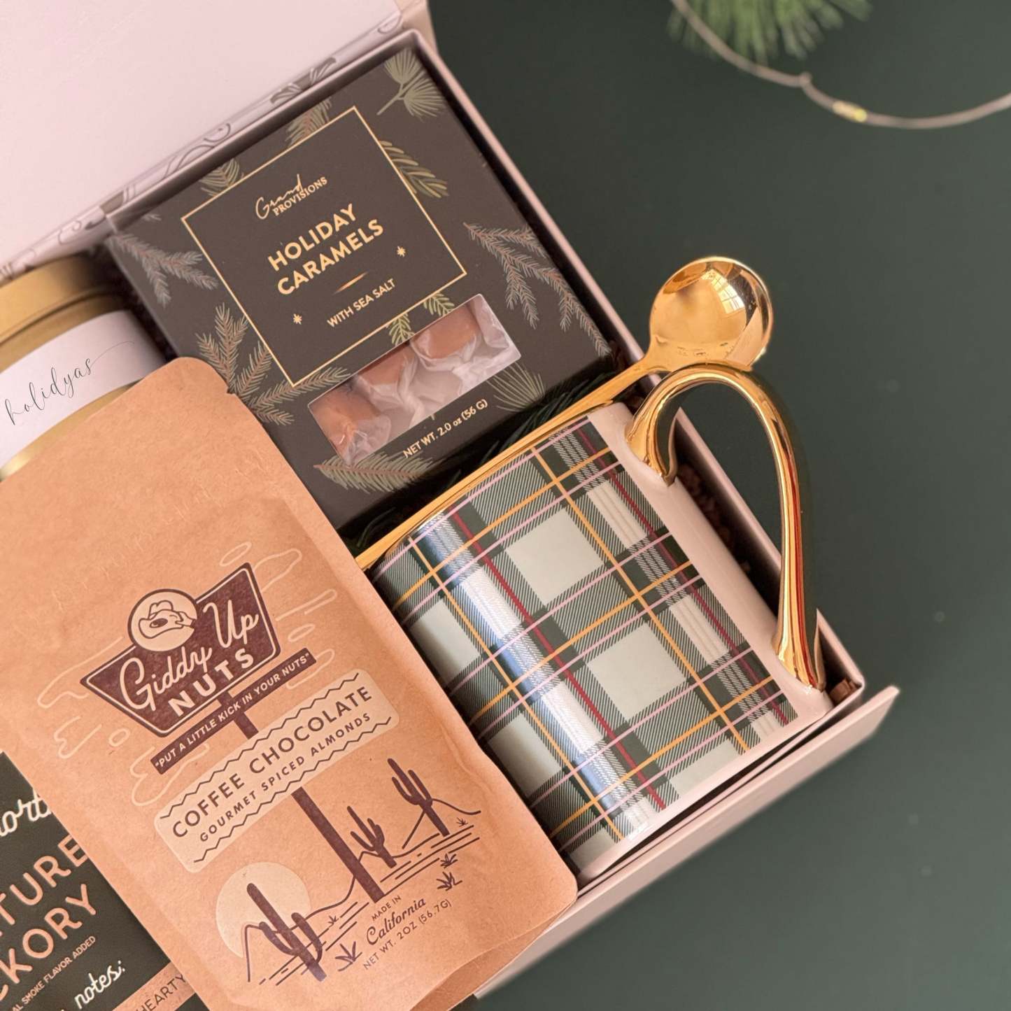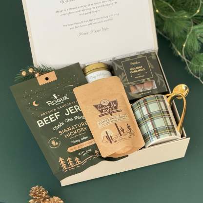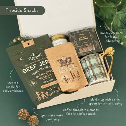Bring warmth and rustic charm to the season with the Fireside Snacks Gift Box �� a cozy, savory twist on holiday gifting. Perfectly curated for relaxed winter evenings, this box blends indulgence and comfort with artisan treats and rich flavors. Inside, you��ll find handcrafted hickory beef jerky, coffee chocolate almonds, buttery holiday caramels, a plaid ceramic mug with a gold spoon, and a festive candle �� all wrapped in elegant, nature-inspired packaging. Designed for those who love cozy nights, hearty snacks, and a touch of seasonal glow.