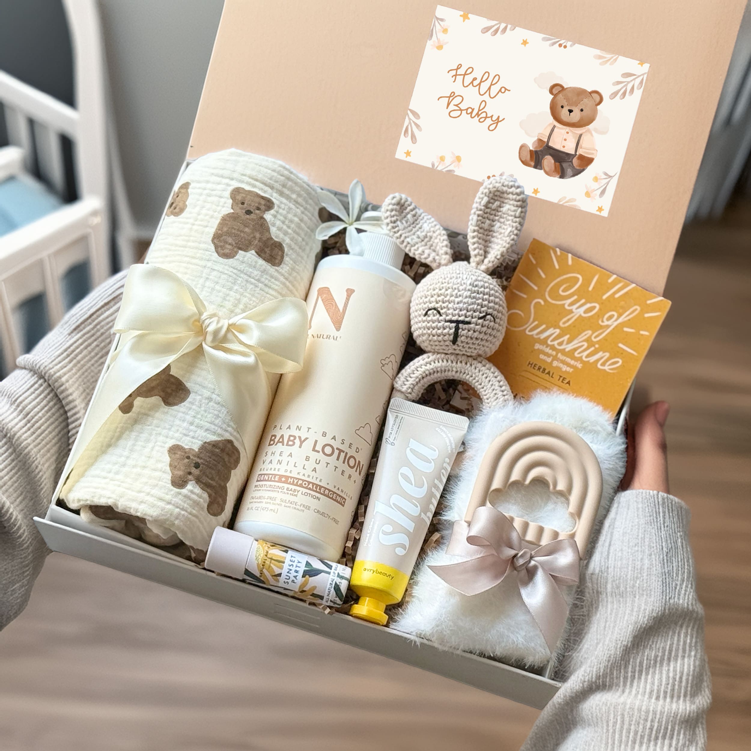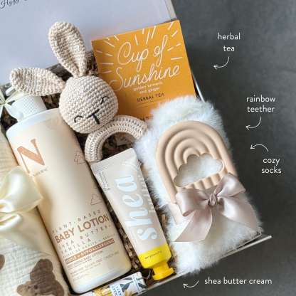 A sweet, calming gift for mom and baby��includes a soft swaddle, bunny rattle, fluffy socks, herbal tea, and gentle care items for moments of rest and connection.