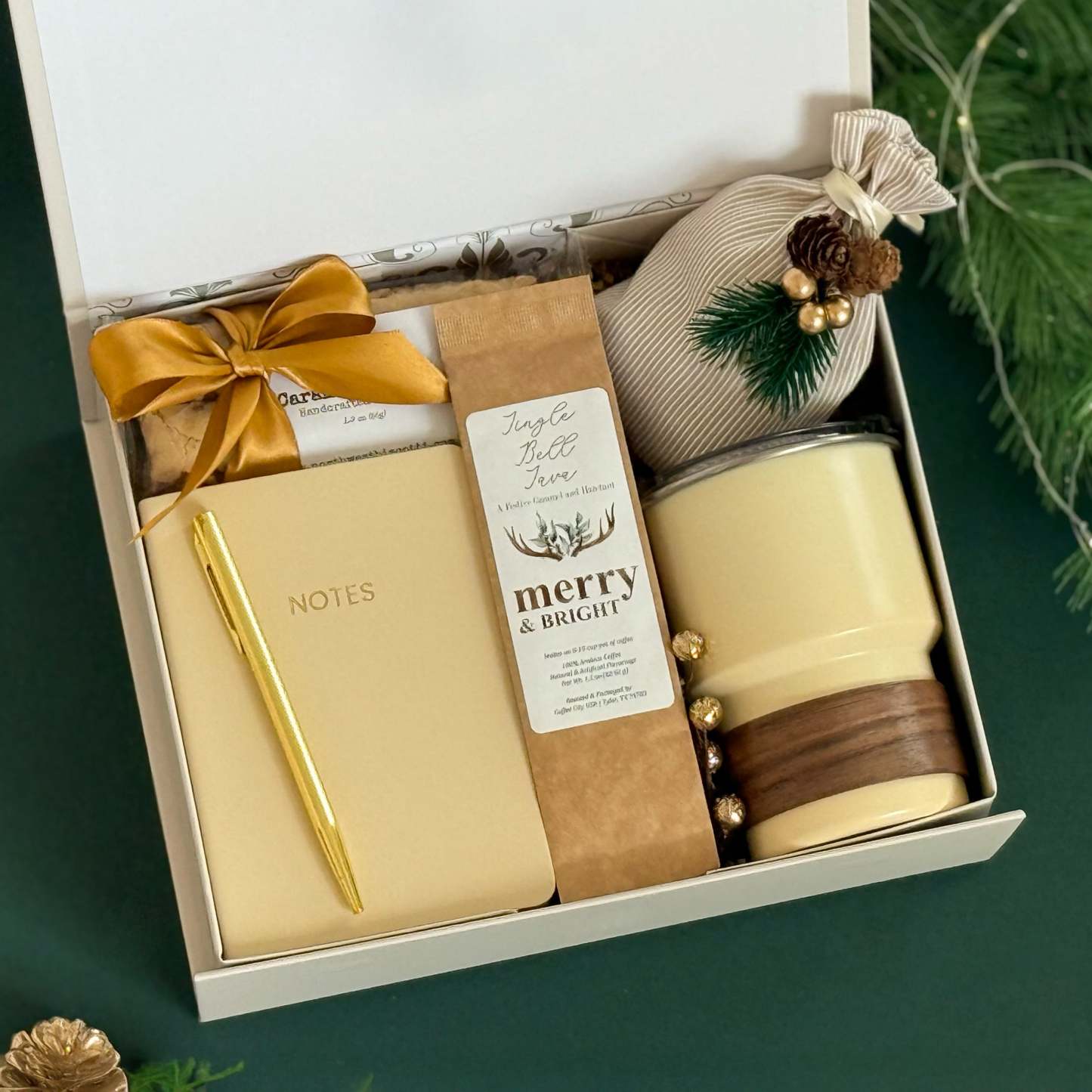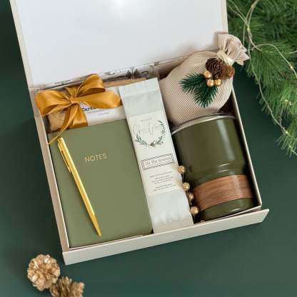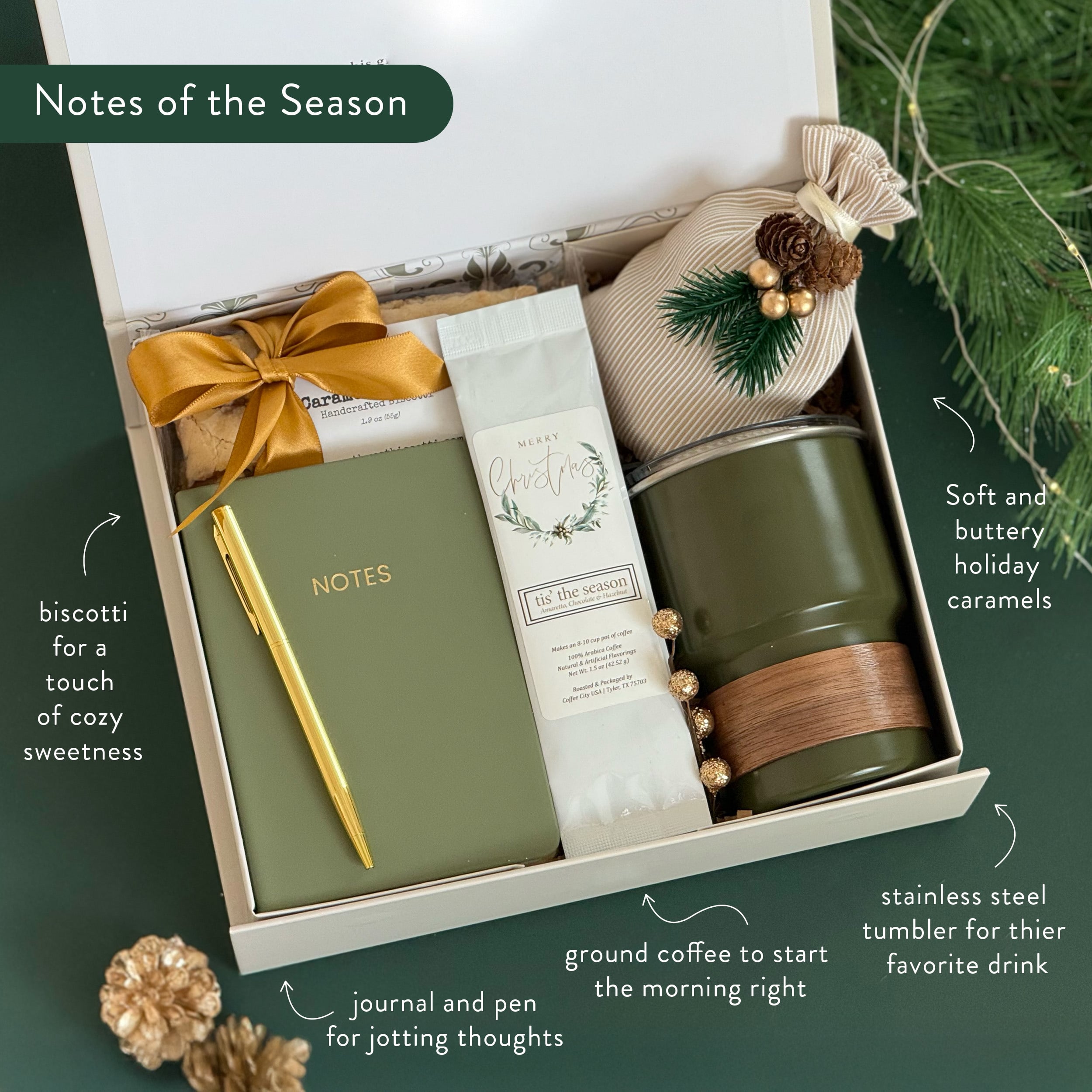 Start the day with warmth, calm, and understated elegance. The Notes of the Season Gift Box is a beautifully curated collection that blends cozy textures with refined, festive style. Designed for peaceful mornings or thoughtful gifting, it features a sleek olive journal with a gold pen, smooth ����Tis the Season�� coffee, buttery caramels, and crisp biscotti for a classic pairing. A modern evergreen tumbler completes the set �� perfect for enjoying coffee or tea in timeless style. Finished with golden ribbon and holiday greenery, this gift box embodies the simple, elevated joy of the season