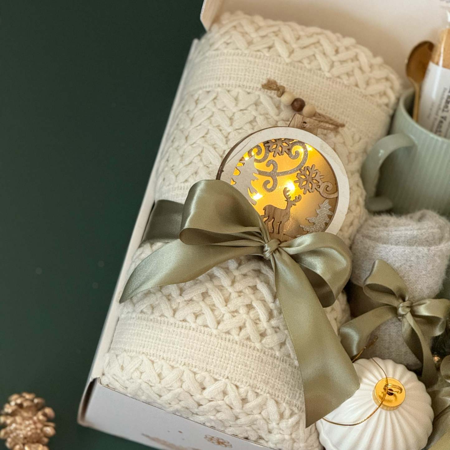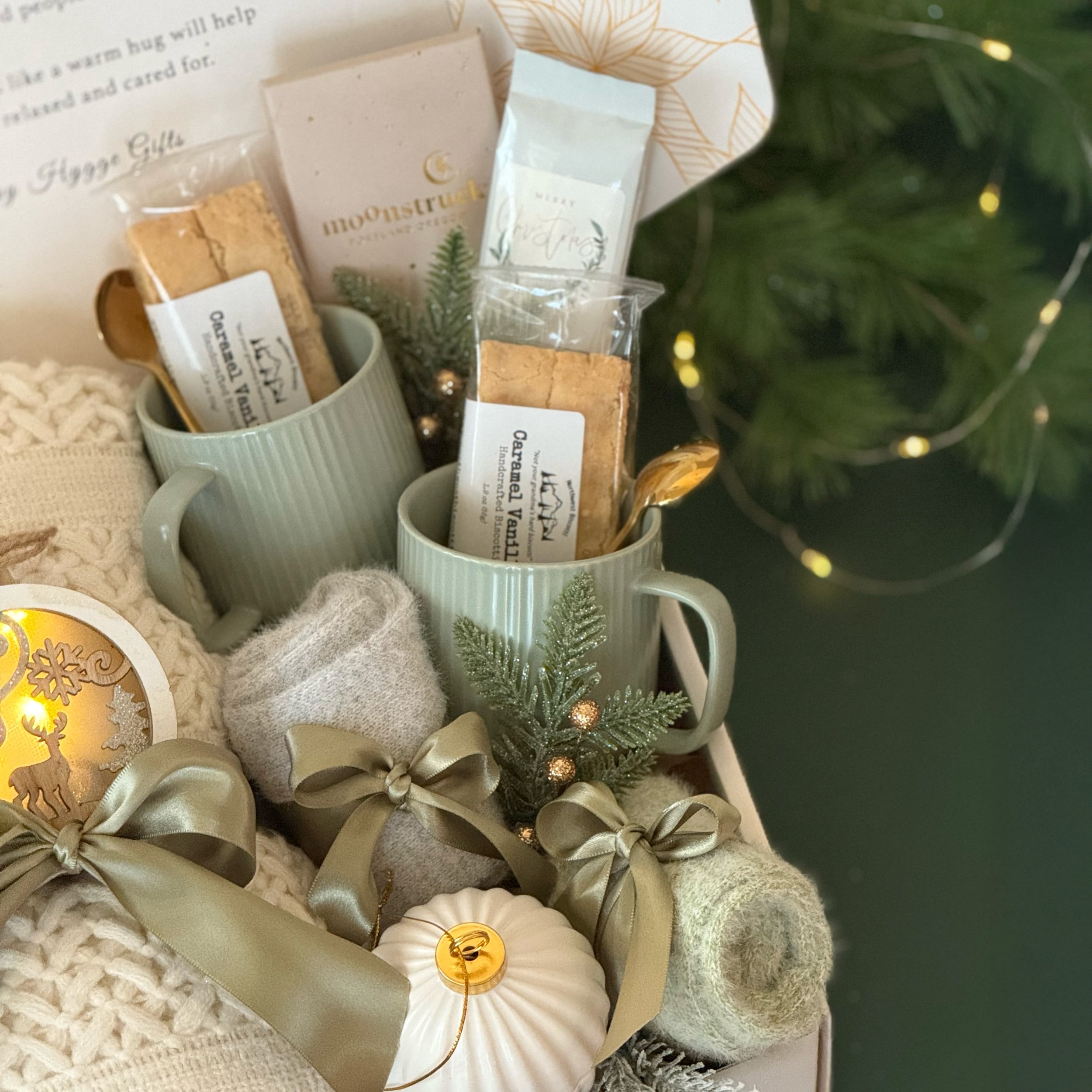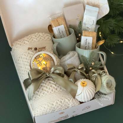 Celebrate warmth, comfort, and connection with the The Comfort Duo Gift Box �� a beautifully curated collection designed for cozy shared moments. Perfect for couples, families, or close friends, this elegant holiday set combines artisan flavors, soft textures, and glowing accents to create an unforgettable winter experience. Inside, you��ll find two ribbed ceramic mugs with matching gold spoons, rich ground coffee, crisp biscotti, and smooth milk chocolate. A chunky knit throw and plush socks add layers of comfort, while golden LED ornaments and a gold-and-white ceramic candle bring a touch of festive glow. Thoughtfully finished with satin ribbons and greenery, it��s the perfect way to share warmth and joy this holiday season.